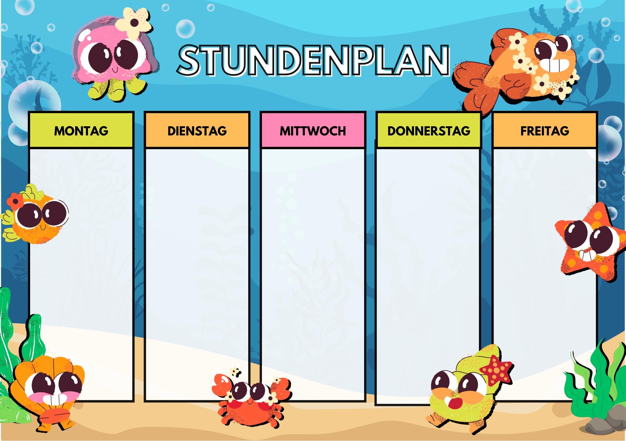 Farbenfrohe Designs und eine übersichtliche Struktur helfen deinem Kind dabei, den Stundenplan schnell zu verstehen und sich sicher im Alltag zu orientieren.
